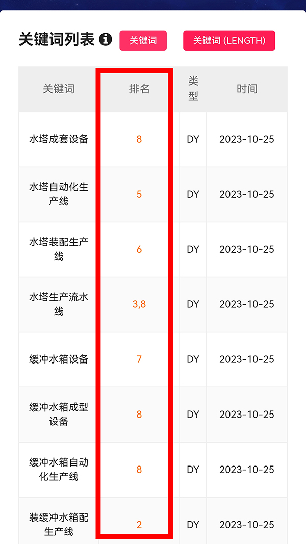 首頁(yè)   >   短視頻矩陣SEO優(yōu)化推廣  >  32天內(nèi) 120個(gè)水塔設(shè)備關(guān)鍵詞上首頁(yè),最高當(dāng)日44個(gè)咨詢