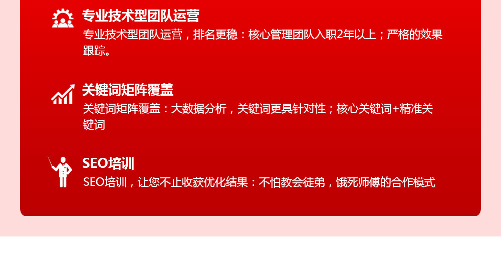 上線時間快,最快一周讓您排首頁 關(guān)鍵詞不限,幾十個關(guān)鍵詞上線 白帽優(yōu)化手法,專業(yè)團隊運作更穩(wěn)定 免費優(yōu)化培訓,培訓企業(yè)御用推廣專員 15年優(yōu)化經(jīng)驗,我們更了解排名規(guī)則變化