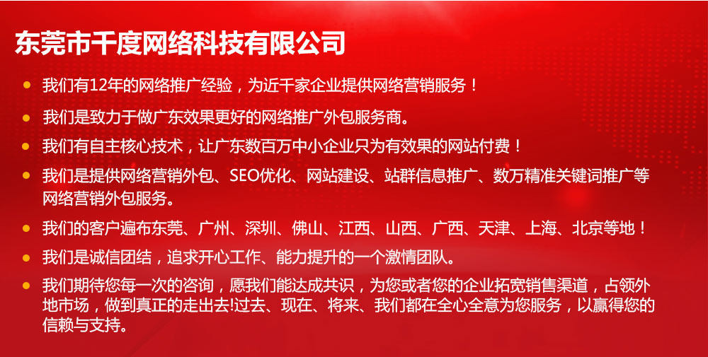 我們有15年的網(wǎng)絡(luò)推廣經(jīng)驗,為1027家企業(yè)提供網(wǎng)絡(luò)營銷服務(wù)! 我們是致力于做廣東效果更好的網(wǎng)絡(luò)推廣外包服務(wù)商。 我們有自主核心技術(shù),讓廣東數(shù)百萬中小企業(yè)只為有效果的網(wǎng)站付費! 我們提供短視頻矩陣關(guān)鍵詞優(yōu)化、短視頻運營、SEO優(yōu)化、網(wǎng)站建設(shè)等網(wǎng)絡(luò)營銷外包服務(wù)。 我們的客戶遍布東莞、廣州、深圳、佛山、江西、山西、廣西……更多+