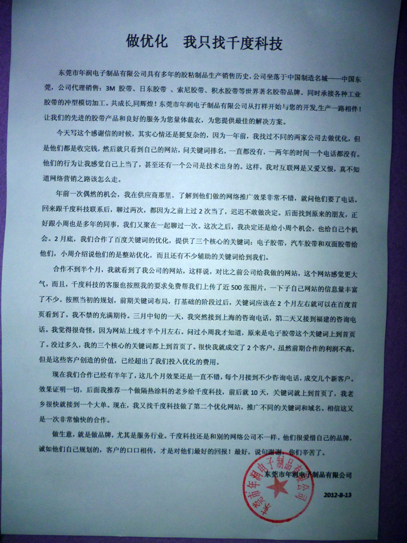 合作不到半個月,我就看到了我公司的網(wǎng)站,這樣說,對比之前公司給我做的網(wǎng)站,這個網(wǎng)站感覺更大氣,而且,千度科技的客服也按照我的要求免費幫我們上傳了近500張圖片,一下子自己網(wǎng)站的信息量豐富了不少。按照當(dāng)初的規(guī)劃,前期關(guān)鍵詞布局,打基礎(chǔ)的階段過后,關(guān)鍵詞應(yīng)該在2個月左右就可以在百度首頁看到了,我不禁的充滿期待。三月中旬的一天,我突然接到上海的咨詢電話,第二天又接到福建的咨詢電話。我覺得很奇怪,因為網(wǎng)站上線才半個月左右。問過小周我才知道,原來是電子膠帶這個關(guān)鍵詞上到首頁了。沒過多久,我的三個核心的關(guān)鍵詞都上到首頁了。很快我就成交了2個客戶,雖然前期合作的利潤不高,但是這些客戶創(chuàng)造的價值,已經(jīng)超出了我們投入優(yōu)化的費用。